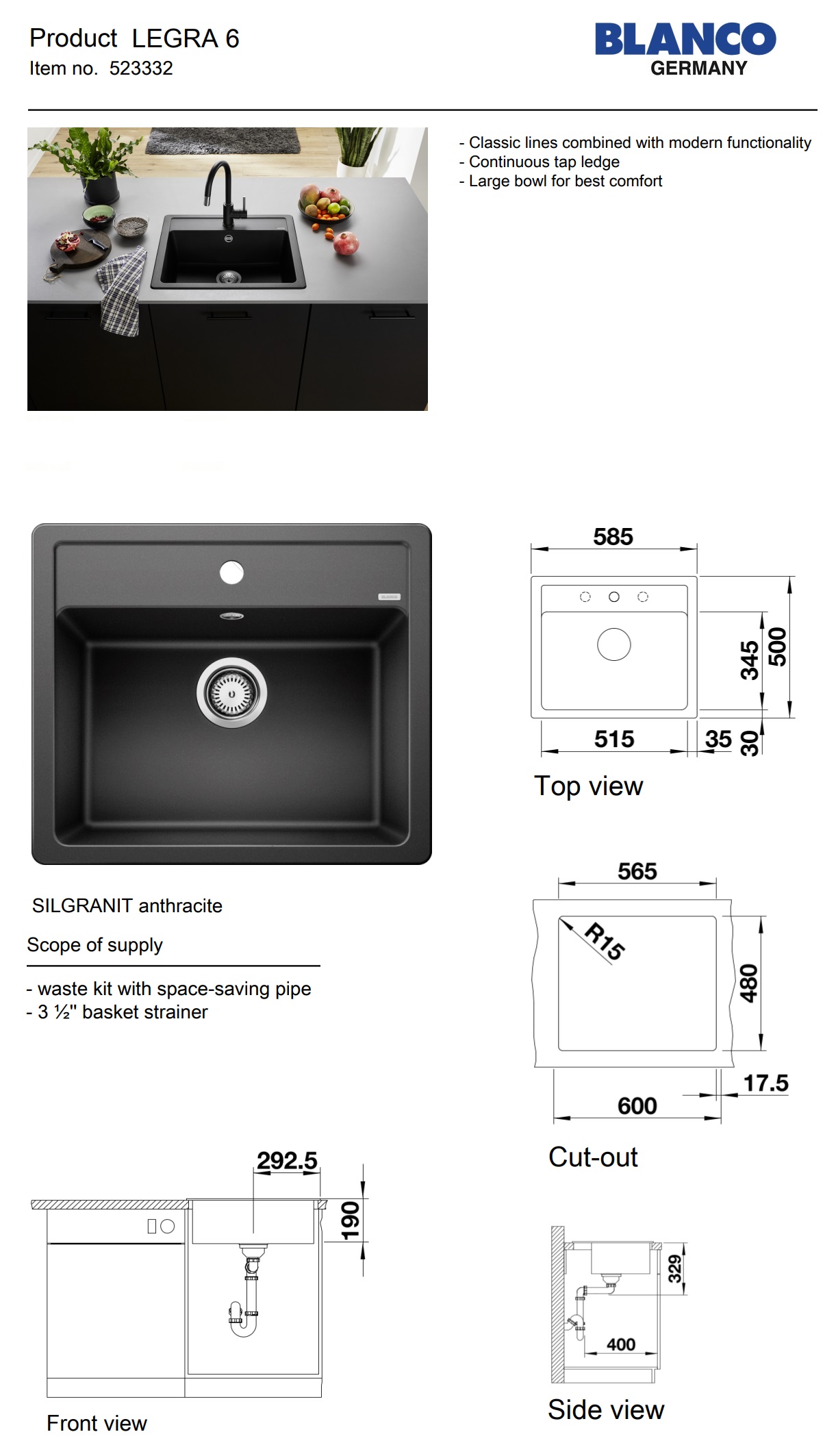 BLANCO LEGRA 6 Top Mount Single Bowl Granite Kitchen Sink. Enquire Our Best Offer.