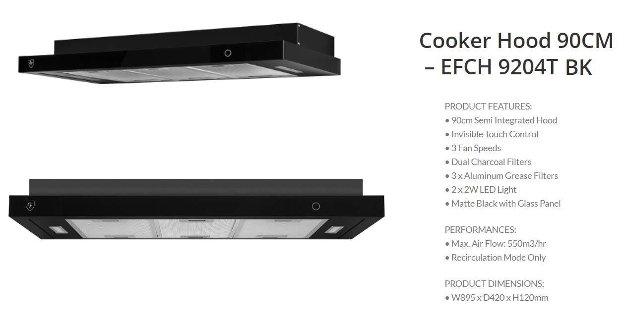 EF New Model Built-In Cooker Hood EFCH9204T BK In Full Black Color, Invisible Touch Control. Special Offer With Free Delivery. No GST Charge.