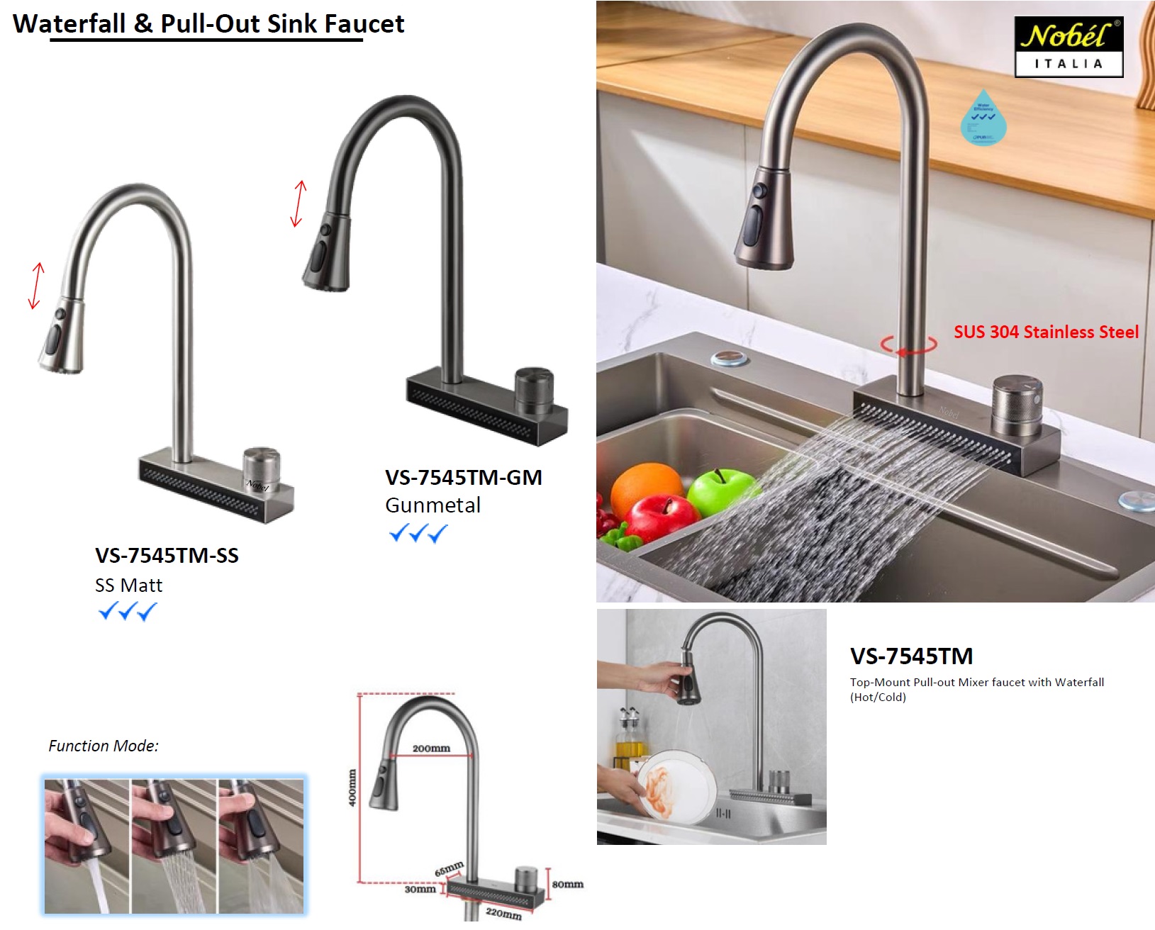 NOBEL Water Fall & Pull-Out Kitchen Sink Mixer Tap VS-7545TM-SS & GM