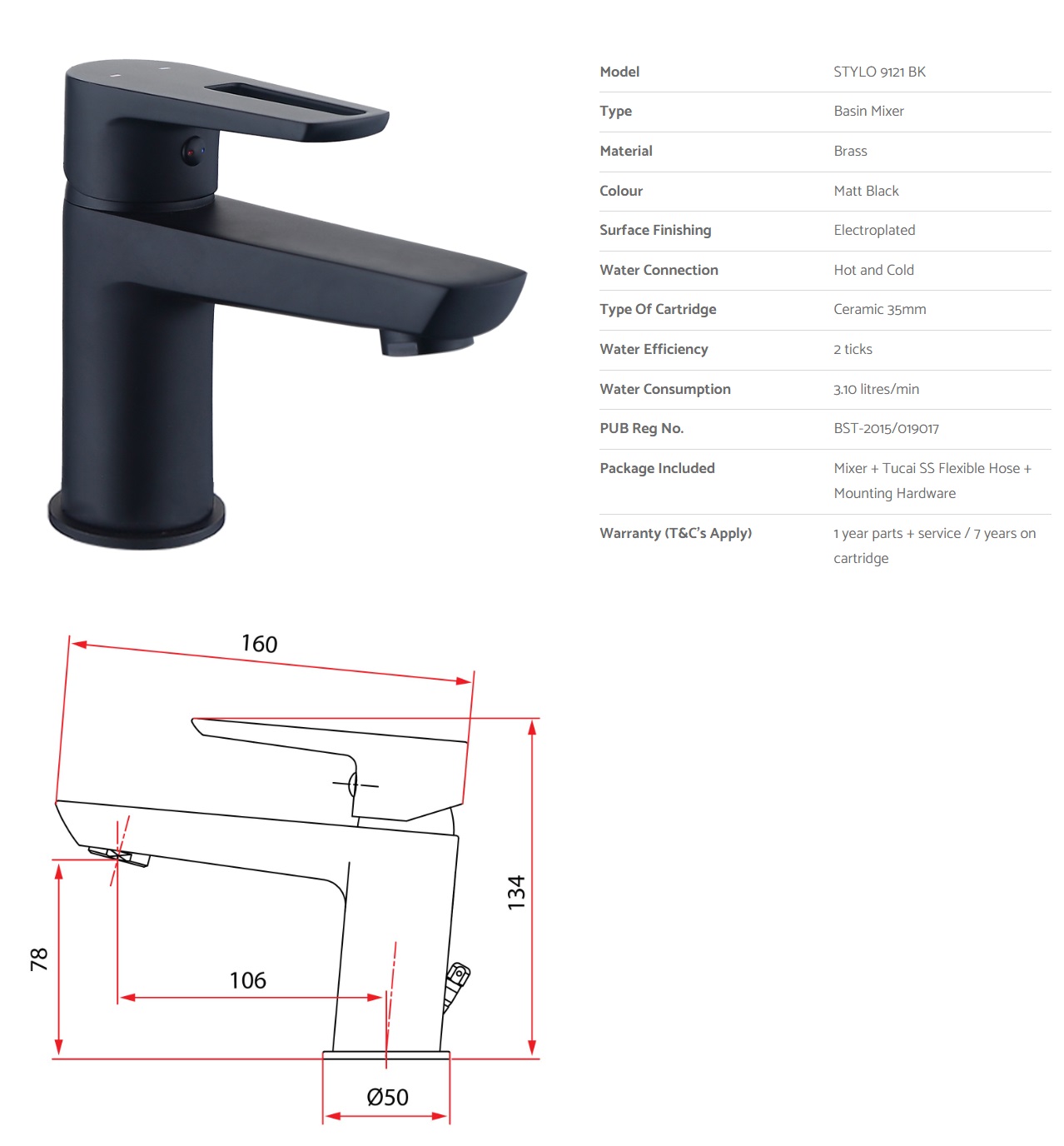 Grab this stylish design Rubine Black color basin mixer tap STYLO 9121 BK at good discount today
