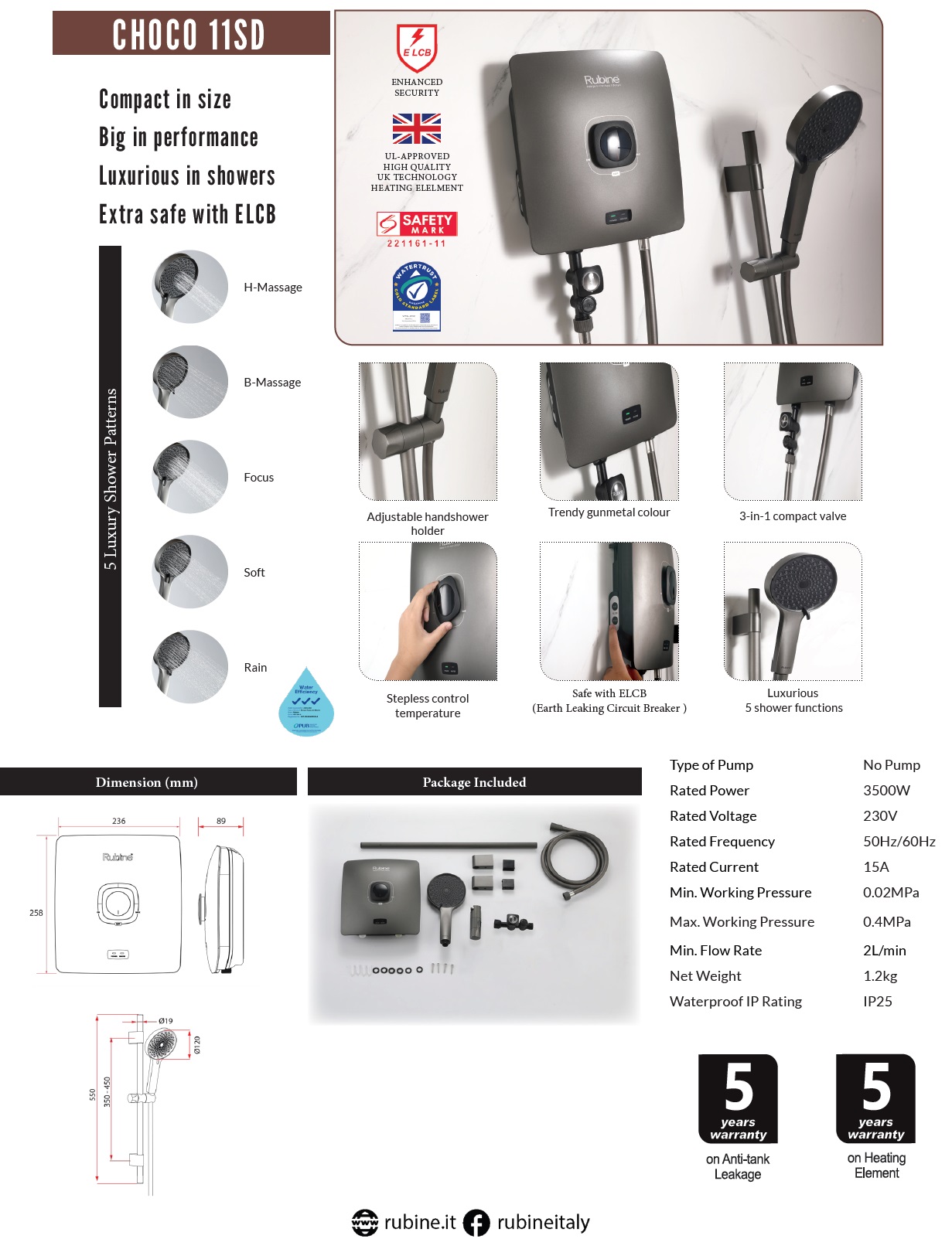 RUBINE Electric Instant Water Heater CHOCO 11SD-GM