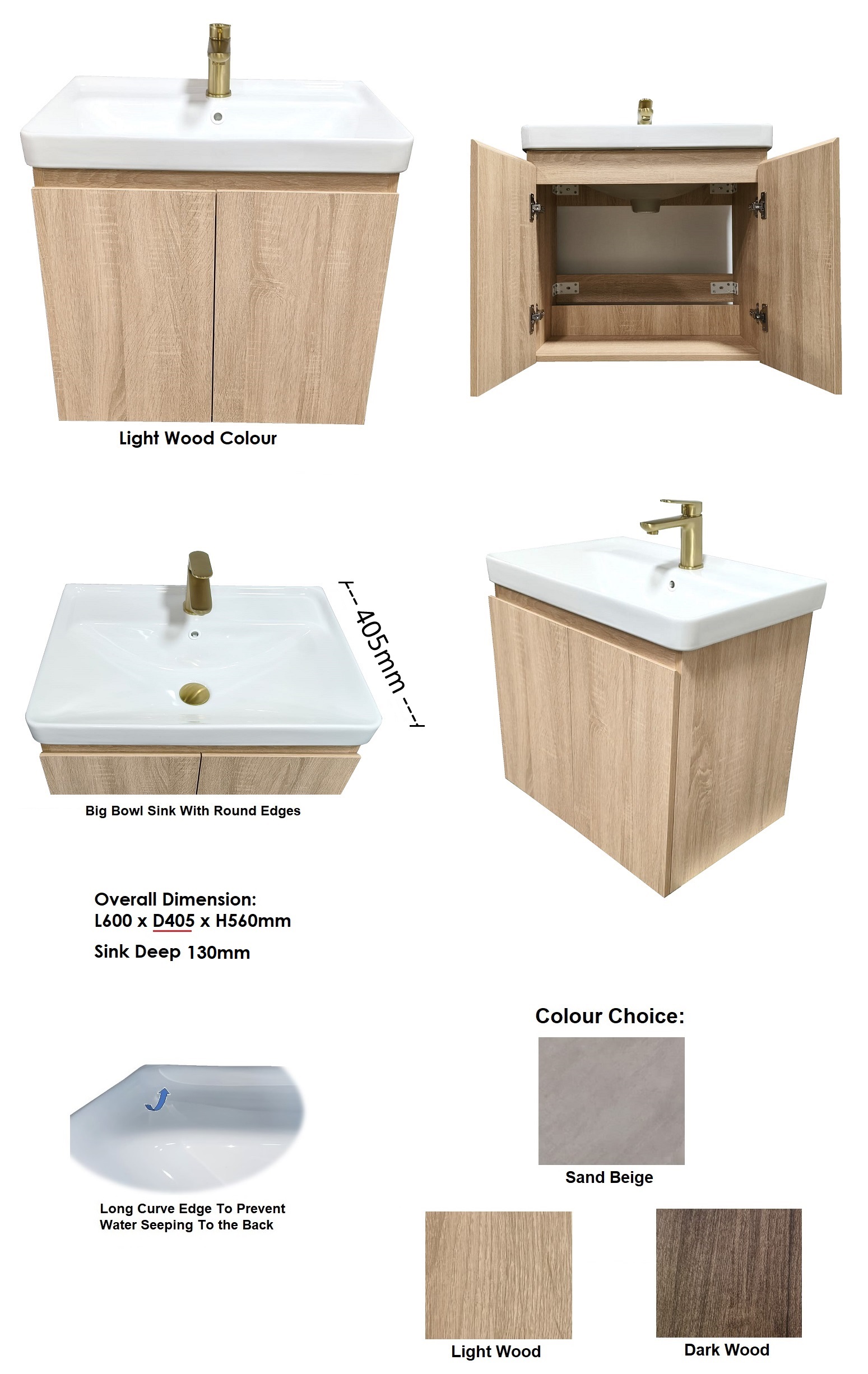Overall Dimension (Include Basin): L600 x D405 x H560mm Sink Deep 130mm
