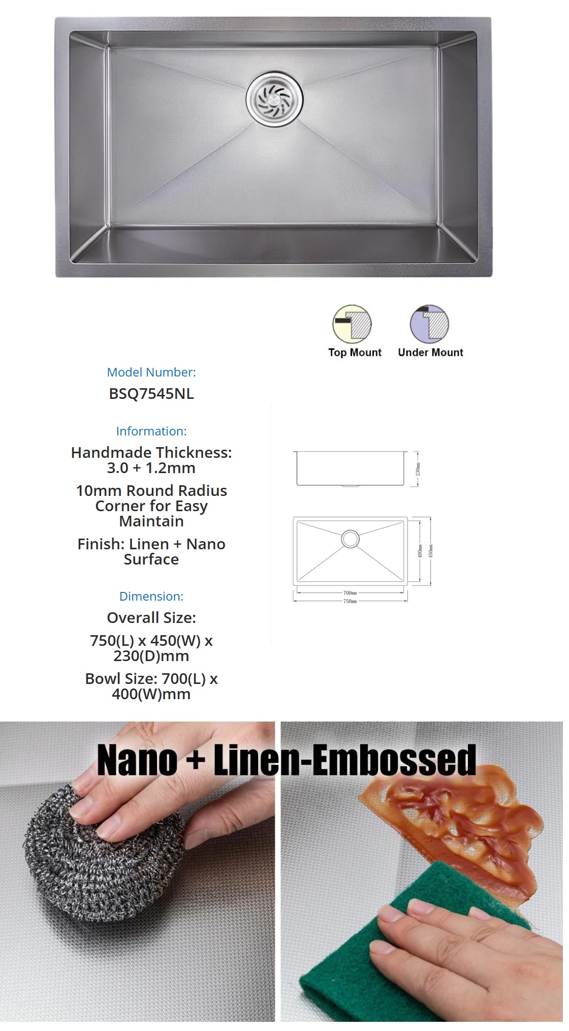 BOSHSINI BSQ 7545NL Single Bowl Quality Food Grade 304 Stainless Steel Nano + Linen Embossed Texture