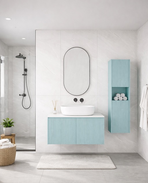 The cabinet features a vertical design with concealed storage, helping to keep toiletries neatly organised and the bathroom clutter-free.