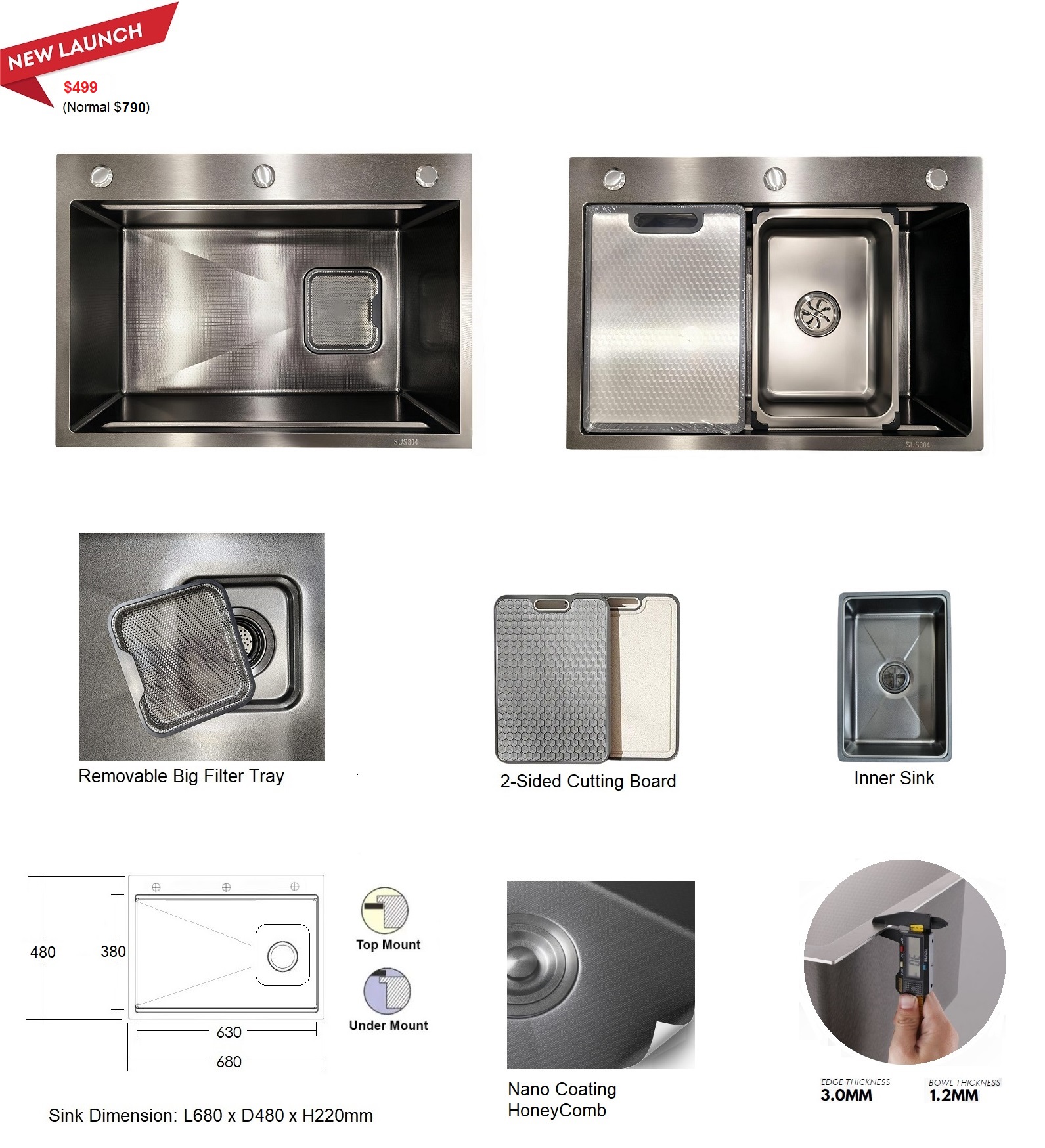 Sink Dimension: L680 x D480 x H220mm