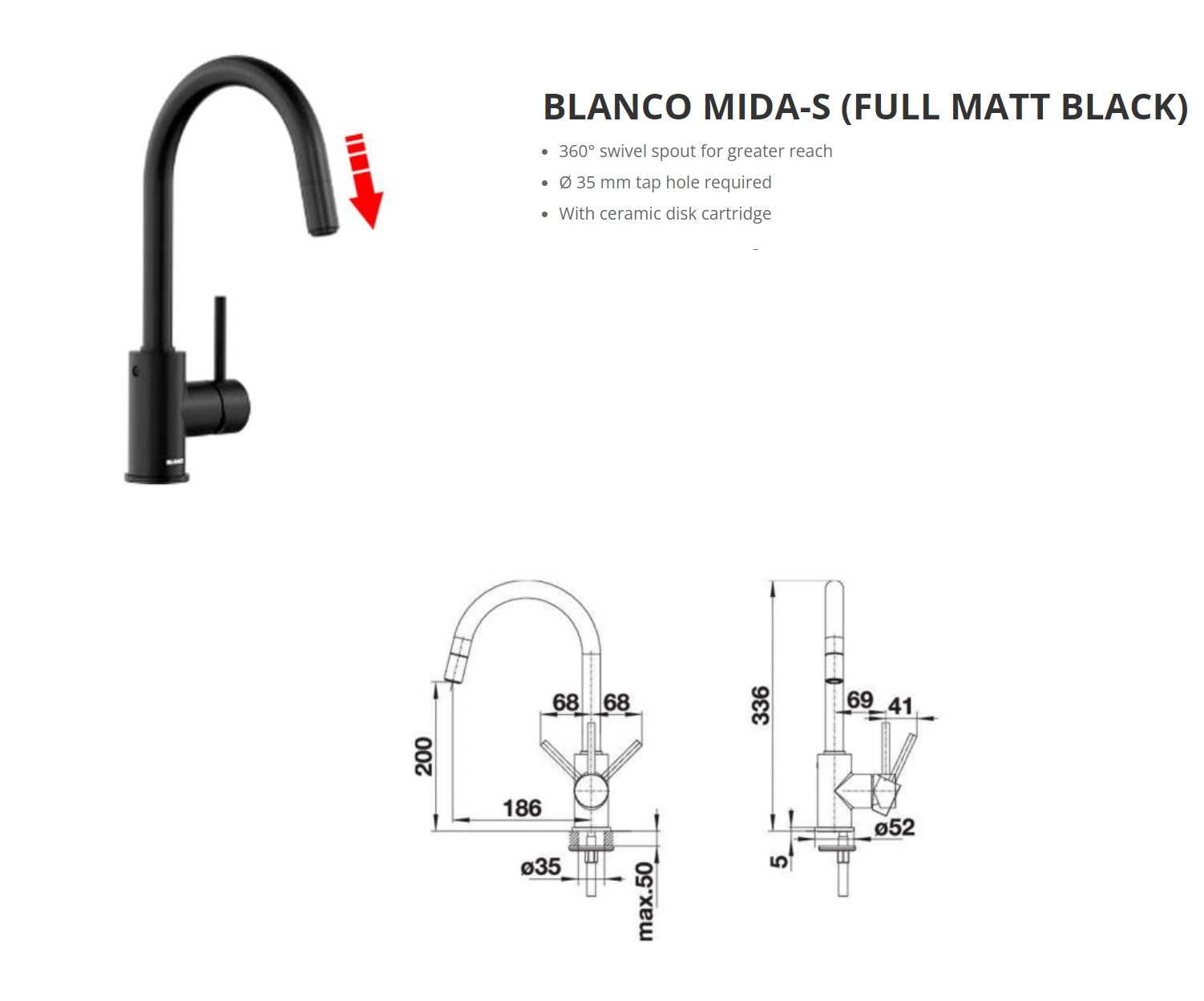 BLANCO MIDA-S Pull-Out Kitchen Sink Mixer Tap Matt Black - Offer while stocks last