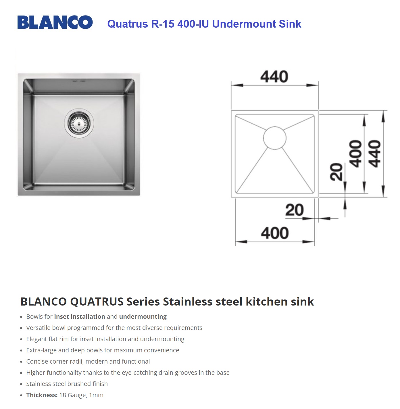 BLANCO Quatrus 400-IU Stainless Steel Under Mount Kitchen Sink. Enquire Our Best Offer.