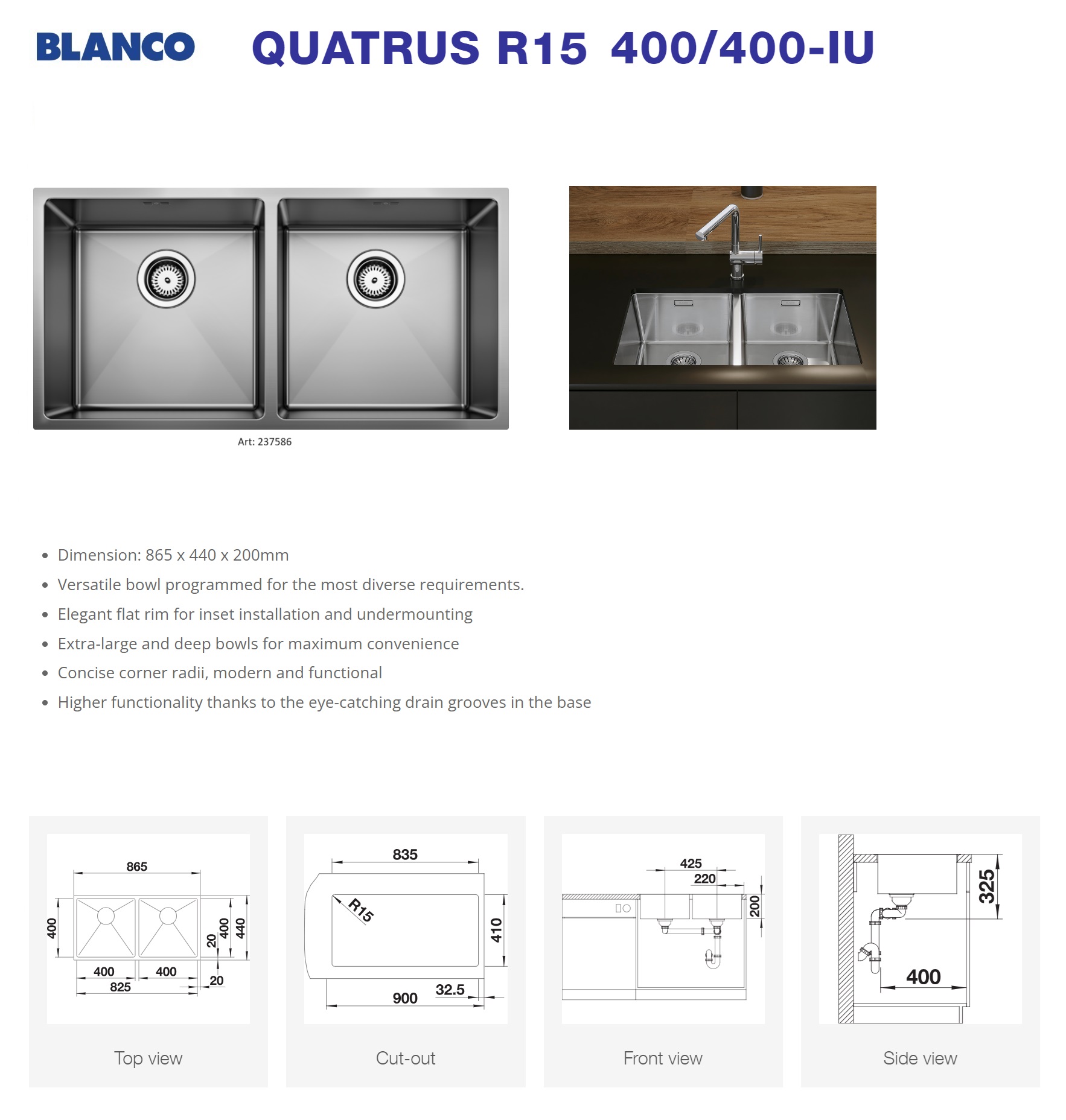 BLANCO Quatrus 400/400-IU Stainless Steel Undermount Kitchen Sink. Enquire Our Special Offer Price.