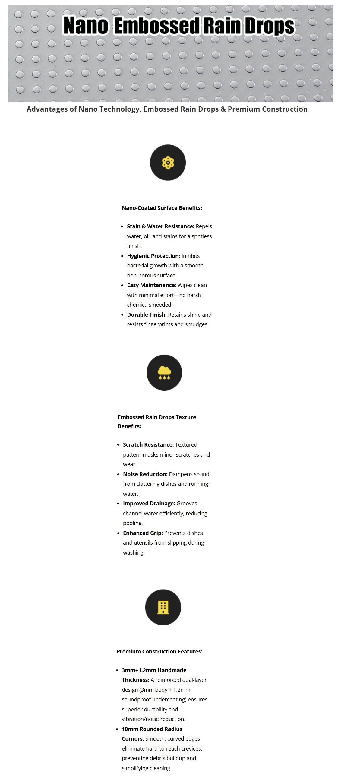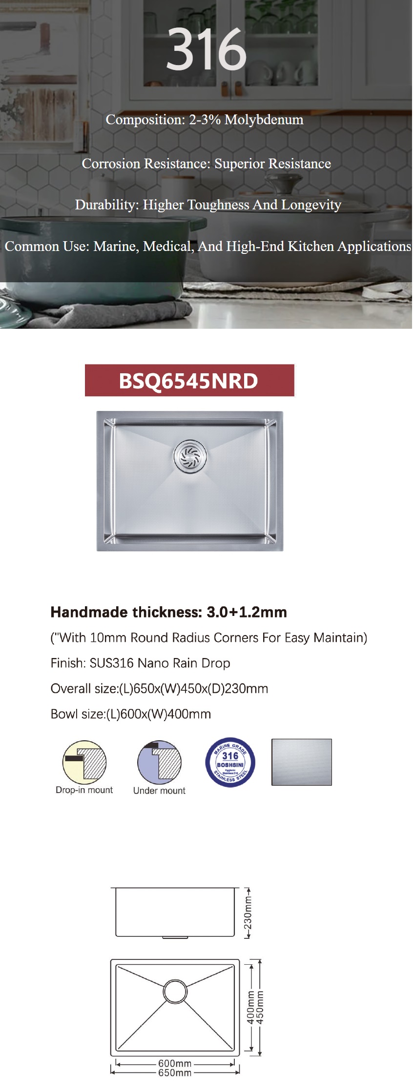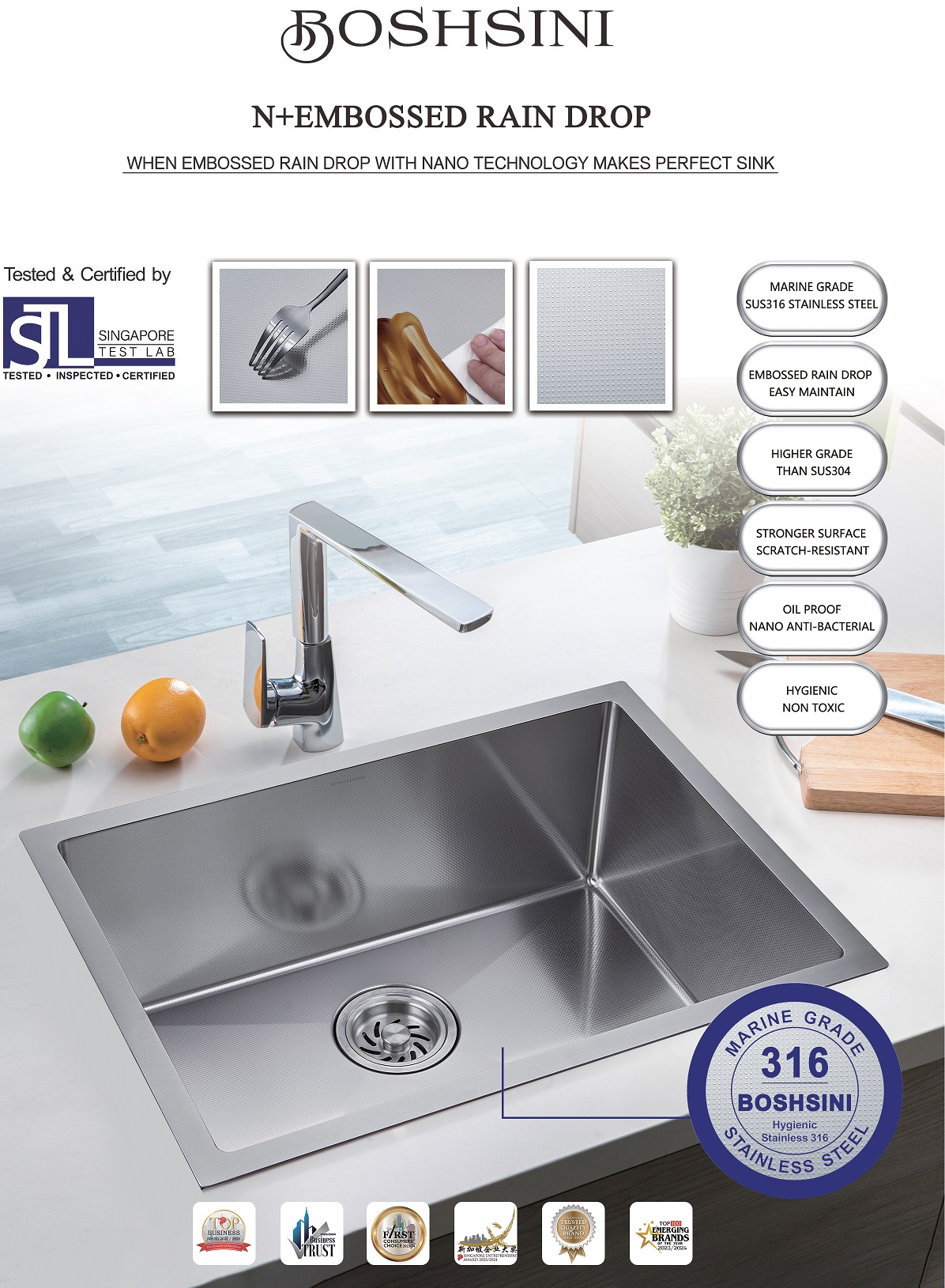 BOSHSINI BSQ 6545NRD Single Bowl Quality 316 Stainless Steel Nano + Embossed Rain Drop Texture