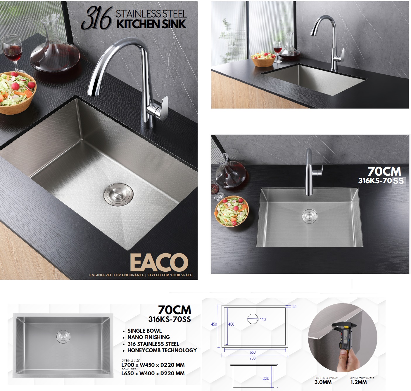 EACO 316 Stainless Steel Nano + Honey Comb Kitchen Sink - Engineered For Endurance