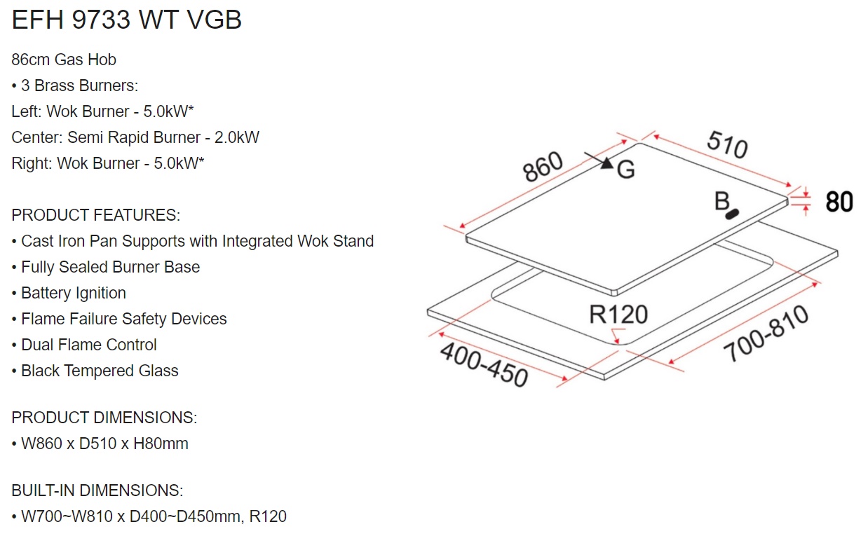 EF Model EFH 9733 WT VGB Tempered Glass 3 Burners Gas Cooker Hob Come With Powerful Triple Rings Burner. Best Offer In Singapore. Come with Free delivery, with No GST Charge.