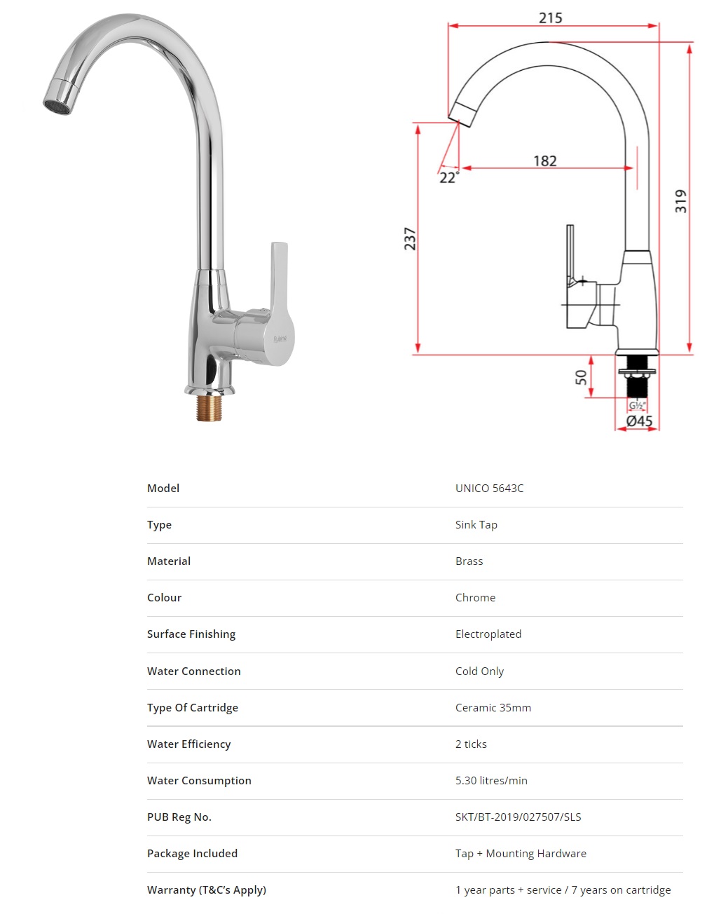RUBINE Kitchen Sink Cold Water Tap - UNICO 5643C