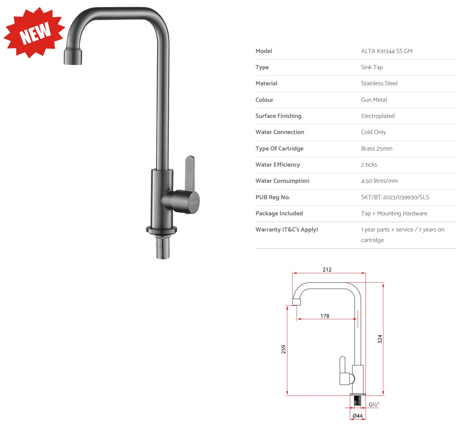 RUBINE Stainless Steel Kitchen Sink Cold Tap - K91344 SS GM