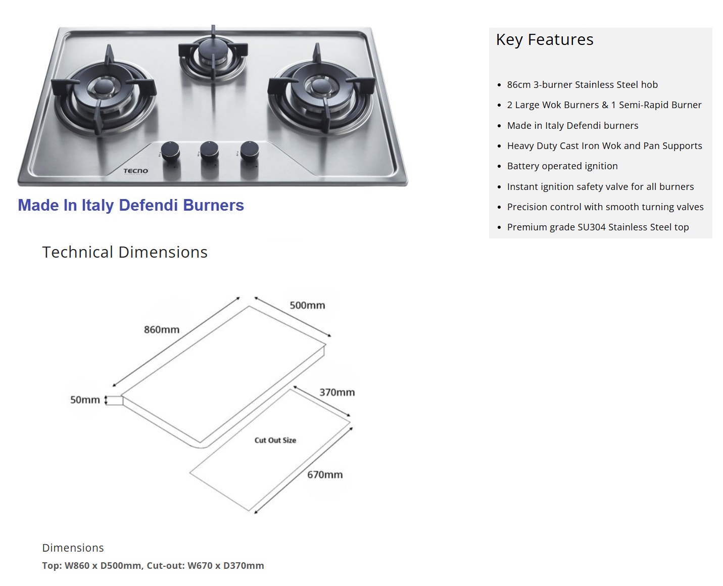 TECNO 3-Burner Stainless Steel Cooker Hob TS 8633TRSV With Made In Italy Defendi Burners