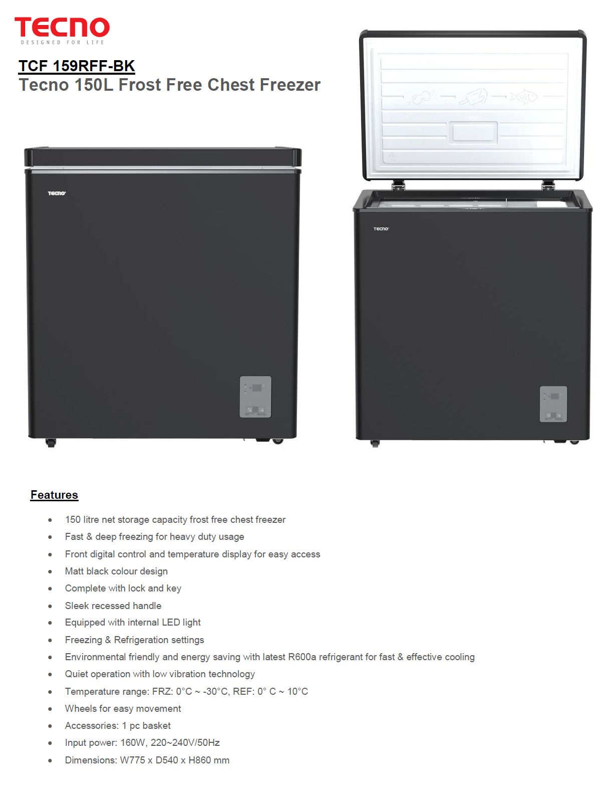 Tecno lates model 150L Frost Free Chest Freezer - TCF-159RFF-BK