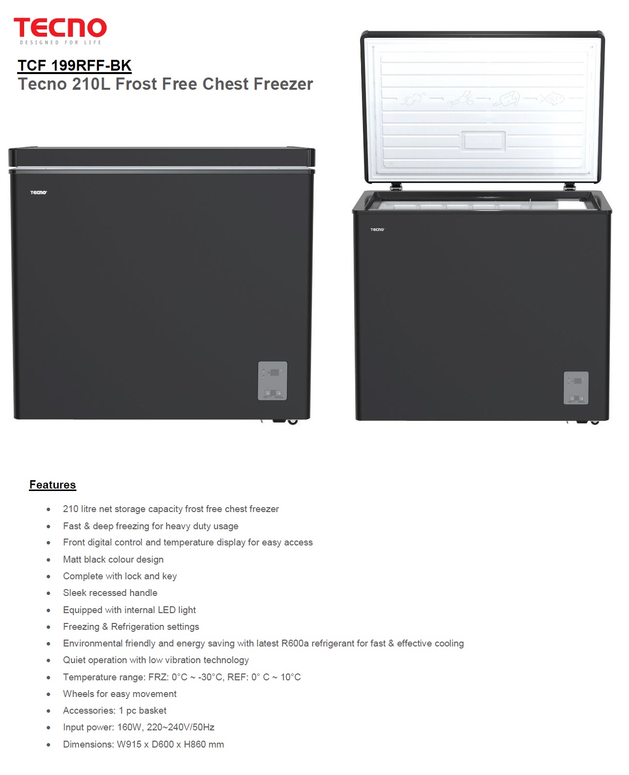 Tecno lates model 210L Frost Free Chest Freezer - TCF-199RFF-BK