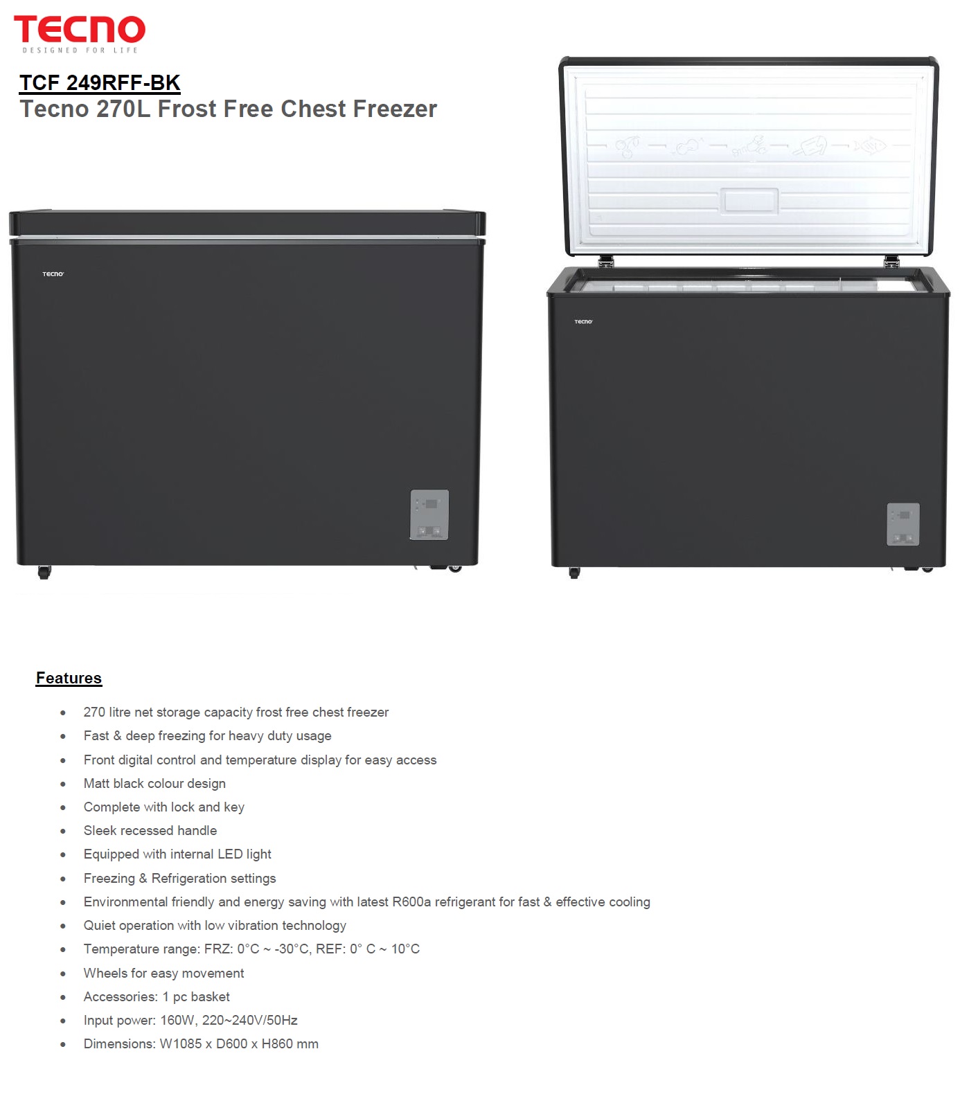 Tecno lates model 270L Frost Free Chest Freezer - TCF-249RFF-BK