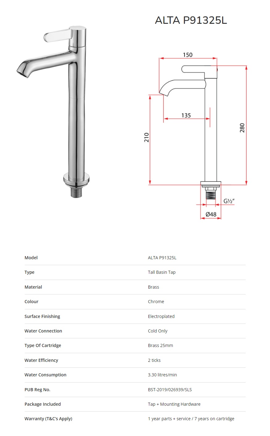 Rubine ALTA P91325L Tall Basin Cold Water Tap