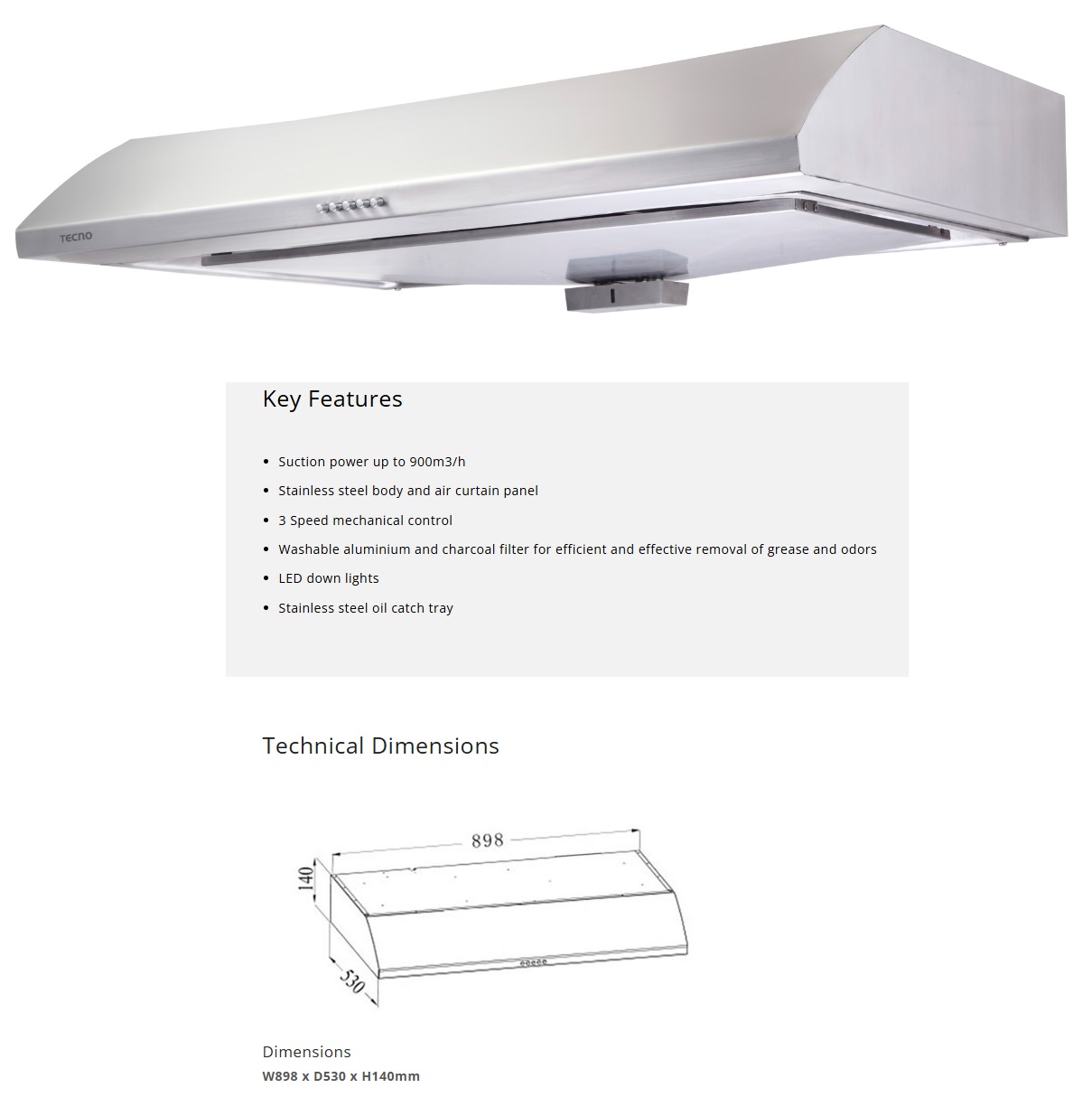 TECNO Stainless Steel Cooker Hood With Cyclonic High Suction Power.